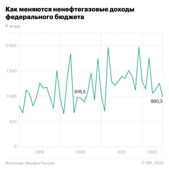 Ненефтегазовые доходы федерального бюджета в июле сократились на 29% в годовом выражении, до 990 млрд руб. (в июле прошлого года было 1,39 трлн), следует из данных Минфина, которые изучил РБК. Нефтегазовые поступления тоже снизились, но менее значительно — на 22% год к году, до 771 млрд руб. В целом сокращение бюджетных доходов достигло 26% к июлю 2021 года, их объем составил 1,76 трлн руб.