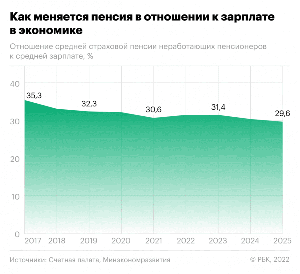 В предстоящие годы принцип роста средних пенсий неработающих пенсионеров (у работающих пенсии не индексируются) быстрее инфляции будет соблюден, отмечает Счетная палата. Однако этот рост средней пенсии будет отставать от динамики зарплат в экономике. С 1 января 2023 года пенсии неработающих пенсионеров будут повышены на 4,8%, с 1 января 2024-го — на 4,6%. Совокупный размер индексации в 2023–2024 годах «с учетом индексации, произведенной досрочно, с 1 июня 2022 года на 10%, составил 20,58% <…>, что превышает прогнозируемую совокупную инфляцию — 18,58%», указано в документе. Что касается средней зарплаты в экономике, Минэкономразвития прогнозирует рост этого показателя на 25% к 2025 году (до 80 тыс. руб.) по сравнению с оценкой за 2022 год. В аппарате вице-премьера Татьяны Голиковой, отвечающей за социальную политику, перенаправили запрос в ПФР. РБК направил вопросы в фонд.