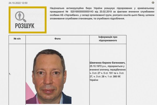 «Национальное антикоррупционное бюро Украины разыскивает подозреваемых в уголовном производстве от 20.02.2019 по фактам совершения должностными лицами АБ «Укргазбанк» в составе организованной группы хищения средств этого банка путем злоупотребления служебным положением, служебного подлога», — говорится в сообщении.