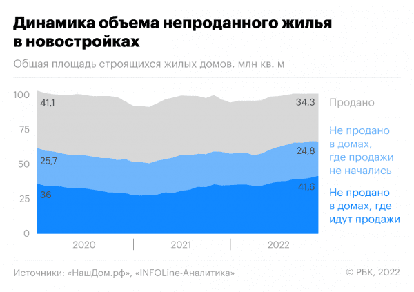 Площадь нераспроданных квартир в новостройках по всей России в декабре 2022 года достигла 66 млн кв. м. Почти столько же было в январе 2020 года. Как менялась доля непроданных квартир — в инфографике РБК