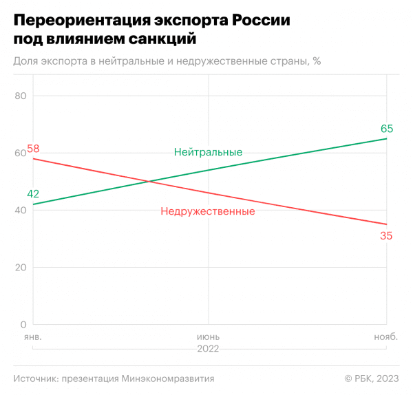 В документе впервые раскрывается степень эффективности переориентации российского экспорта от недружественных стран — тех, кто ввел санкции против России в 2022 году или присоединился к ним. По данным Минэкономики, доля недружественных экономик в экспорте из России к концу 2022 года снизилась до 35%, тогда как еще в начале года занимала 58%. Соответственно, доля нейтральных и дружественных стран увеличилась с 42 до 65%. Исходя из показателей, приведенных министерством, экспорт в такие страны за январь—ноябрь составил почти $350 млрд.