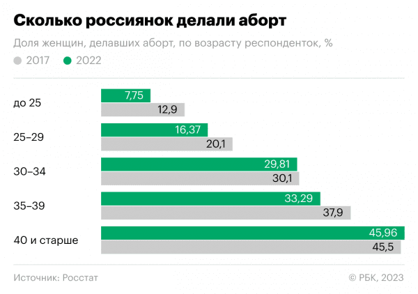 Параллельно с увеличением распространенности контрацепции Росстат фиксирует снижение доли женщин, делающих аборты. Наибольшее сокращение этой доли за последние пять лет наблюдается в возрастной категории до 25 лет: оно составило 5 п.п. (с 12,9% в 2017 году до 7,7% в 2022 году). В более старших возрастах тоже была зафиксирована позитивная динамика: в категории 25–29 лет снижение составило почти 4 п.п., до 16%, а в категории 35–39 лет — почти 5 п.п., до 33%.