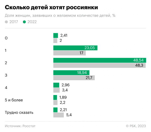 По данным Росстата, в 2022 году большинство россиянок (71,6%) желали иметь одного или двух детей. В 2017 году таких было 65,3%. Но если доля высказавшихся за двоих по сравнению с 2017 годом почти не изменилась (чуть более 48%), то доля желающих иметь единственного ребенка увеличилась на 6 п.п. — с 17% в 2017 году до 23% в 2022 году. Параллельно сократилось число женщин, которые хотели бы стать многодетными матерями: россиянок, желающих иметь троих детей, стало меньше почти на 3 п.п. (18,9%), четверых — на 0,5 п.п. (2,9%), а пятерых и более — на 0,3 п.п. (1,9%). Кроме того, подросла доля женщин, которые в принципе не хотят иметь детей: на 0,4 п.п., до 2,4%.