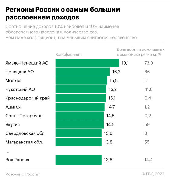 Как выглядят регионы с самым большим и самым маленьким расслоением — в инфографике РБК.