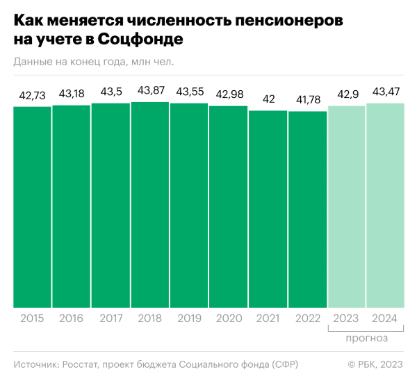 Численность пенсионеров покажет позитивную динамику впервые с 2018 года. С 2019 года в России началось поэтапное увеличение пенсионного возраста в ходе пенсионной реформы. При этом, согласно графику реформы, в 2023 году в России на пенсию по старости не выходят ни мужчины, ни женщины.