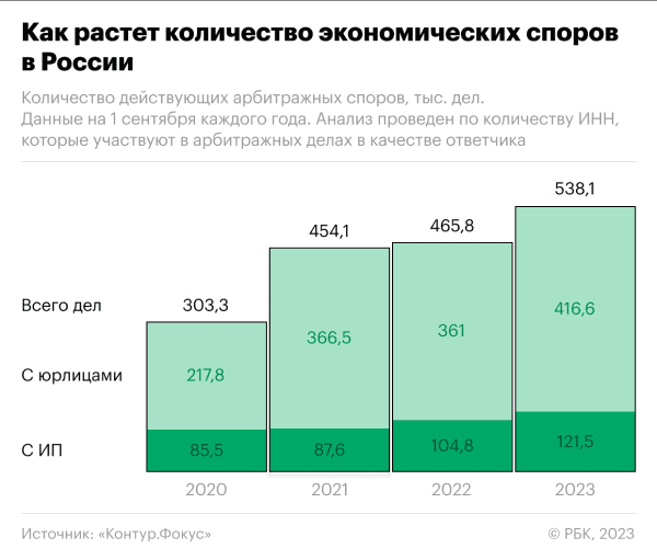 По состоянию на 1 сентября 2023 года количество участников рассматриваемых споров в российских арбитражных судах (они разбирают споры с участием предпринимателей и организаций) увеличилось на 16% по сравнению с показателем годичной давности и превысило 538 тыс. Об этом говорится в исследовании сервиса «Контур.Фокус» (есть у РБК). По сравнению с 1 сентября 2020 года разбирательств стало больше на 77%.