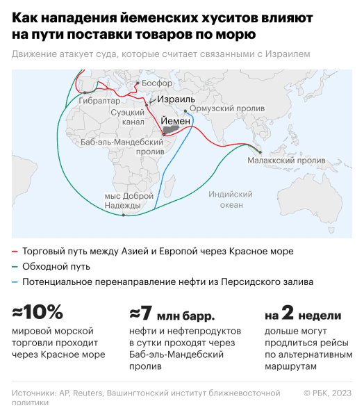Нападения на суда в Красном море участились на фоне войны Израиля и ХАМАС: хуситы заявили, что в ответ на «отвратительную израильско-американскую агрессию в секторе Газа» будут атаковать корабли под флагом Израиля, а также суда, эксплуатируемые или принадлежащие израильским компаниям.