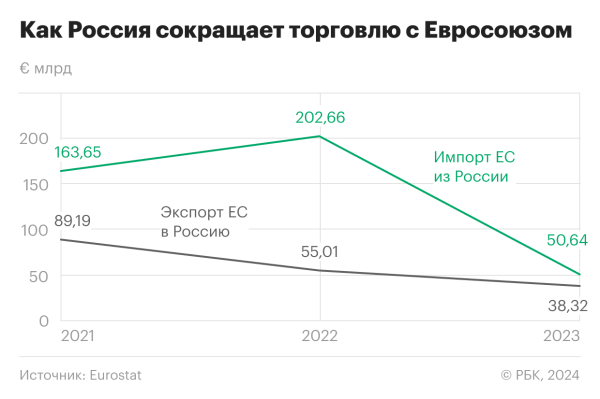 Товарооборот стран Евросоюза с Россией в 2023 году сократился в стоимостном выражении в 2,9 раза по сравнению с аномальным 2022 годом (тогда мировые цены на нефть в среднем составляли $100 за баррель, и Россия, несмотря на начавшийся разрыв торговых связей с Западом, заработала более €90 млрд на продаже в европейские страны нефти и нефтепродуктов). Относительно «досанкционного» 2021 года оборот взаимной торговли ЕС и России снизился в 2,8 раза. По итогам 2023 года импорт российских товаров в 27 стран ЕС составил €50,64 млрд, а экспорт ЕС в Россию — €38,32 млрд, следует из опубликованной 15 февраля статистики европейского агентства Eurostat, проанализированной РБК.