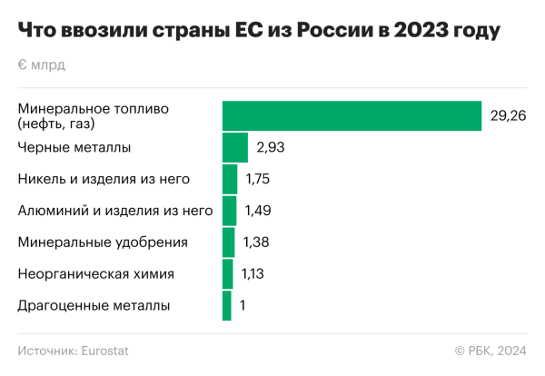 Хотя в конце 2022 года — начале 2023-го Евросоюз ввел эмбарго на импорт российских нефти и нефтепродуктов, поставки российского трубопроводного газа и СПГ не были затронуты рестрикциями. Тем не менее, если в 2021 году российский природный газ, по данным Совета ЕС, обеспечивал более 40% газового импорта ЕС, по итогам 2023 года эта доля уменьшилась до 8% (в частности, на это повлияла остановка поставок по взорванным «Северным потокам»). Вместе с российским СПГ эта доля составила около 15% совокупного импорта природного газа в Евросоюз, указывает Совет ЕС. По данным Eurostat, в прошлом году ЕС импортировал газообразных углеводородов из России (включая трубопроводный газ и СПГ) на сумму €16,7 млрд (сокращение почти в 2,9 раза к 2022 году).