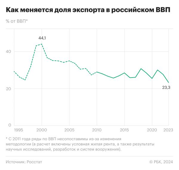 В 2023 году экспорт обеспечил 23,3% ВВП по методу использования доходов по сравнению с 27,7% в 2022 году, говорится в материалах Росстата. Средняя доля в 2011–2022 годах — 27,5%. По данным Банка России, в 2023 году экспорт товаров и услуг составил $465,4 млрд — на 27% меньше, чем в 2022 году. Из них на экспорт товаров приходится $424 млрд. «Действительно, экспорт в отношении к ВВП стал рекордно низким в современной истории, об этом свидетельствуют данные Росстата», — подтверждает научный сотрудник ИЭП им. Е.Т. Гайдара Дмитрий Кузнецов.