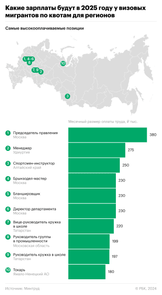 В 2025 году самой высокой зарплатой у высококвалифицированных мигрантов будет 380 тыс. руб. в месяц. Это следует из проанализированного РБК приказа Минтруда от 9 декабря «Об утверждении перечня профессий (специальностей, должностей) для привлечения иностранных работников, прибывающих в Российскую Федерацию на основании визы, на 2025 год».