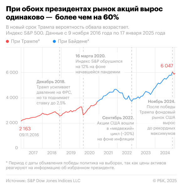 Аналогично темпам роста экономики в нешоковые периоды, американский фондовый рынок и за четырехлетний срок после победы Трампа на выборах-2016, и за сопоставимый период Байдена вырос примерно одинаково — чуть более 60% по индексу широкого рынка S&P 500. После избрания Трампа, 6 ноября, индексы акций США подскочили на 2,5–3,6%, до рекордных уровней, поскольку инвесторы возлагали надежды на стимулирующие эффекты от снижения налогов и дерегулирования. К настоящему времени индекс S&P 500 остается на 2,9% выше, чем в день президентских выборов 2024 года, но все же ниже, чем в декабре.