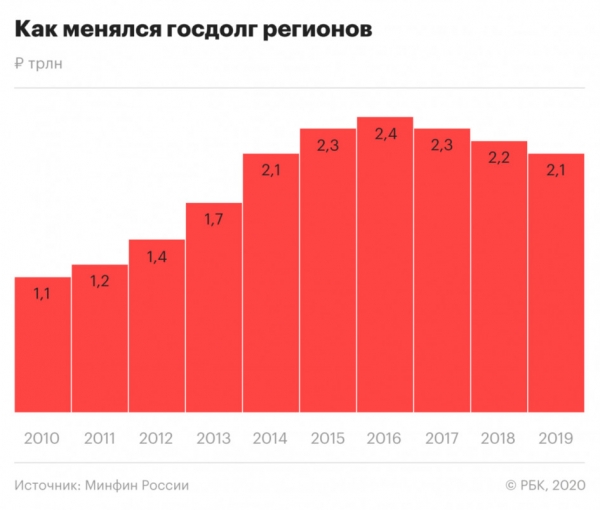 Согласно данным Минфина, совокупный госдолг регионов на 1 января 2020 года составил 2,1 трлн руб., уменьшившись за год на 100 млрд руб. Это минимальный размер регионального госдолга с 2014 года.