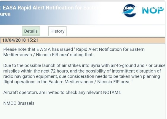 Согласно этому документу, удар по Сирии возможен в течении 72-х часов, что авиакомпании должны учитывать при планировании полетов.