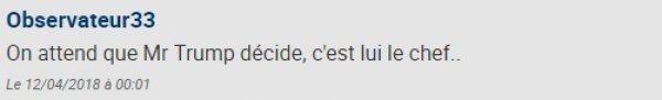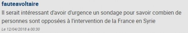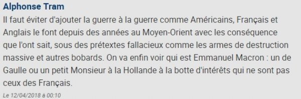«Стоит добавить, что войну ради войны ведут французы, американцы и англичане. В течение многих лет мы лжем про Ближний Восток, оружие массового уничтожения, и воюем за свою ложь. Вы сами увидели, кто такой Макрон – «де Голль» или слуга на побегушках у господина, который защищает интересы не французов», — пишет Alphonse Tram.