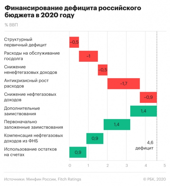 Именно это и ожидает Fitch: в его докладе говорится, что первичный структурный дефицит, определяемый как разница между непроцентными расходами бюджета и доходами (без учета дополнительных нефтегазовых доходов), увеличится в 2020 году с 0,5 (зафиксировано по бюджетному правилу) до 1,9% ВВП. Это позволит дополнительно потратить примерно 1,5 трлн руб., которые будут полностью профинансированы дополнительными заимствованиями.