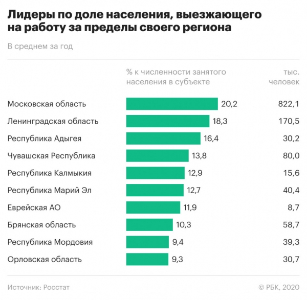 Маятниковая трудовая миграция по итогам 2019 года обеспечила Московской и Ленинградской областям сохранение лидерства по доле занятого населения, выезжающего на работу за пределы своего региона. 20,2% работающего населения Подмосковья (более 822,1 тыс. человек; то есть каждый пятый занятый) трудились в другом субъекте Федерации, в Ленинградской области — 18,3% (170,5 тыс. человек). Ближайшие к Москве и Санкт-Петербургу, эти регионы являются поставщиками рабочей силы в столицы, отметил проректор Финансового университета при правительстве Александр Сафонов. За ними следуют Республика Адыгея (анклав внутри Краснодарского края), в которой 16,4% работающего населения выезжали на работу за ее пределы, Чувашия с 13,8% занятых и Калмыкия с 12,9%, следует из данных Росстата.