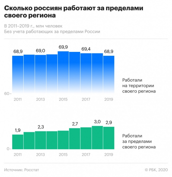 За пределами постоянного проживания в 2019 году работали более 4% занятых, оценил Росстат. Крупнейшими донорами рабочей силы по-прежнему выступают Подмосковье и Ленобласть. После пандемии эксперты ждут усиления трудовой миграции