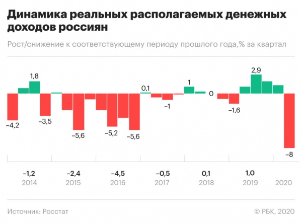 Реальные располагаемые доходы россиян во втором квартале 2020 года, на который пришелся основной удар пандемического кризиса, упали на 8% в годовом выражении, следует из данных Росстата. Это рекордное падение с 1999 года