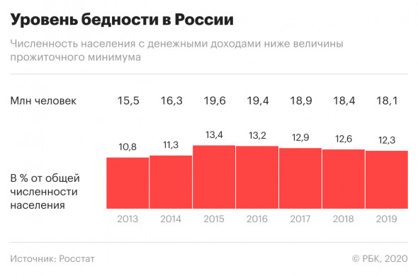 Для измерения бедности Росстат использует концепцию абсолютной бедности, когда доходы населения соотносятся с установленной чертой бедности — прожиточным минимумом. В 2018 году величина прожиточного минимума на душу населения в целом по России составила 10 287 руб., в 2019 году — 10 890 руб.