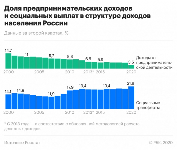 Росстат ведет ежеквартальную статистику структуры денежных доходов по источникам поступления с 1990-х годов, но до 2000 года расчеты велись на бумажных носителях и хранятся в архиве. Публикация квартальных данных началась с 2008 года, уточнили в Росстате. По просьбе РБК статистическое ведомство предоставило ежеквартальные данные о структуре денежных доходов с начала века, то есть за последние 20 лет. С 2000-го по 2019 год доля предпринимательских доходов не опускалась ниже 5,7% (предыдущее минимальное значение было зафиксировано во втором квартале 2019 года).