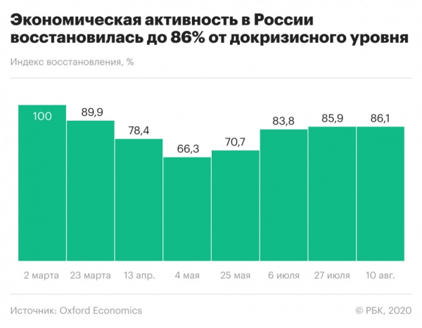 После провала российской экономики на 12% в апреле в годовом выражении темпы сокращения экономической активности в июле—августе, вероятно, улучшились до минус 4–5% год к году, а ВВП приближается к 94–95% от докризисного уровня первого квартала. Такие оценки получила британская консалтинговая компания Oxford Economics с помощью разработанного ею индекса-трекера восстановления российской экономики.
