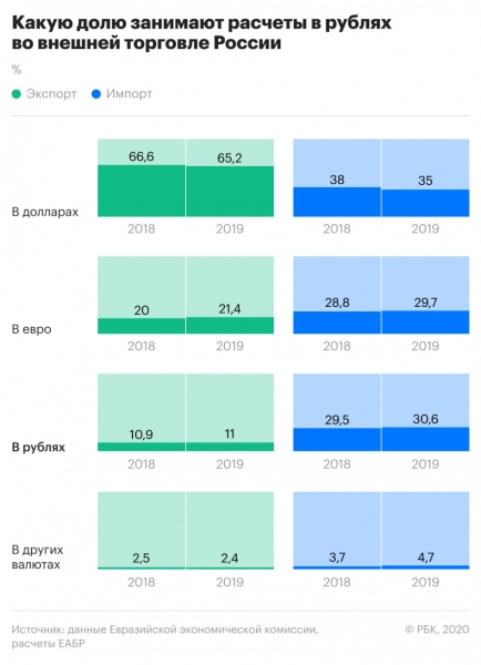 • Доля рубля в торговых расчетах в Евразийском союзе снизилась как по экспорту России — с 73,6% в 2018-м до 72,9% в 2019 году, так и по импорту — с 83,9 до 81%.