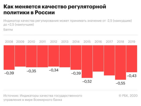 Балл России в индексе качества госрегулирования, по расчетам Всемирного банка, повысился с -0,55 до -0,43. Значения индекса могут варьироваться от -2,5 (худшее) до +2,5 (лучшее). Максимальные позиции в этом индексе занимают Сингапур (2,16), Гонконг (1,98), Новая Зеландия (1,88), Австралия (1,87) и Нидерланды (1,86). По качеству регулирования, измеряемому Всемирным банком, Россия вернулась на уровень 2016 года (см. инфографику). «Россия за последние 15 лет ухудшила позиции в этом индексе при краткосрочных незначительных перемещениях то вниз, то вверх», — сказал РБК доцент департамента политики и управления ВШЭ Даниил Цыганков.