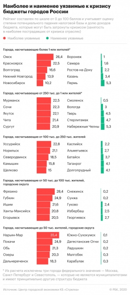 - Среди крупнейших российских городов (с численностью населения свыше 1 млн человек) самыми уязвимыми к пандемическому кризису в «КБ Стрелка» признали Омск, Красноярск и Волгоград. В то же время наиболее устойчивыми, с точки зрения аналитиков, стали Воронеж, Самара и Ростов-на-Дону.
