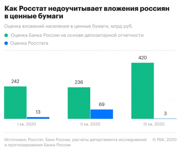 В методологии Росстата по расчету сбережений в государственных и других ценных бумагах не используется депозитарная отчетность, которая дает полную информацию о вложениях населения во все ценные бумаги, купленные через российских брокеров. Таким образом, текущая методология может недоучитывать инвестиции населения в российские ценные бумаги, сообщили РБК в пресс-службе ЦБ. По данным Банка России, в текущей версии методологии Росстата данные берутся из формы № 0409202 «Отчет о наличном денежном обороте», где учитываются только операции, совершенные за наличные деньги. Но их доля «с учетом развития безналичных расчетов и дистанционных операций с ценными бумагами крайне мала».