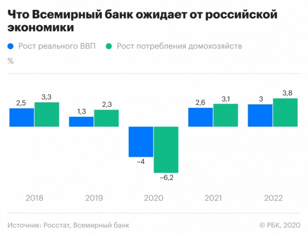В 2021 году экономика сможет отыграть только часть потерь, понесенных в 2020-м, прогнозирует ВБ (рост на 2,6%). При предположении о безопасности и эффективности российской вакцины, которую выведут в гражданский оборот, будет заложена основа для устойчивого восстановления российской экономики со второй половины 2021 года.
