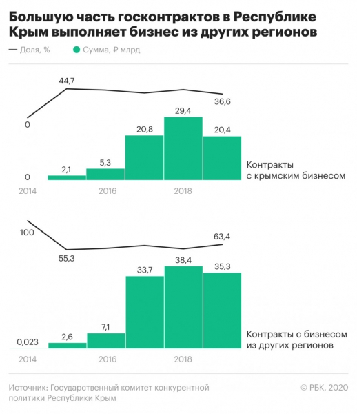 Если в 2014-м, в год присоединения полуострова к России, с местными подрядчиками не было заключено ни одного госконтракта, то за 2019 год доля соглашений с крымским бизнесом составила 36,6%, отмечает госкомитет.