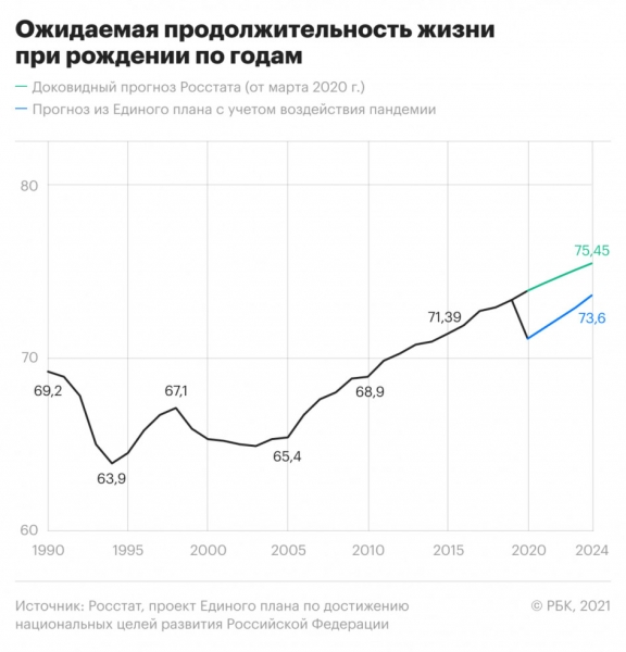 В марте 2020 года Росстат опубликовал демографический прогноз до 2035 года, который еще не учитывал влияние пандемии COVID-19. Согласно базовому сценарию, ожидаемая продолжительность жизни при рождении должна была увеличиться в 2020 году почти до 73,9 года.