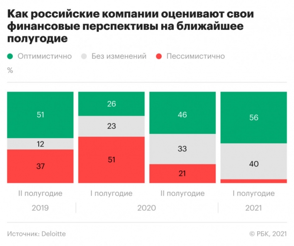 • Опрос Deloitte показал, что 82% респондентов ожидают роста доходов в первой половине 2021 года. Это в два раза выше ожиданий второй половины 2020 года (40%).
