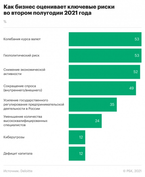 Компании назвали ключевые факторы риска на 2021 год, и большинство респондентов указали на колебания курсов валют и геополитический риск (по 53%). Причем уровень обеспокоенности геополитическими рисками вырос на 23 п.п. по сравнению со второй половиной 2020 года. Администрация президента США Джо Байдена, пришедшего к власти в начале 2021 года, ввела уже несколько раундов санкций в отношении России, в том числе санкции против покупки новых рублевых государственных облигаций на первичном рынке. Байден давал понять, что санкционное давление на Россию будет нарастать.
