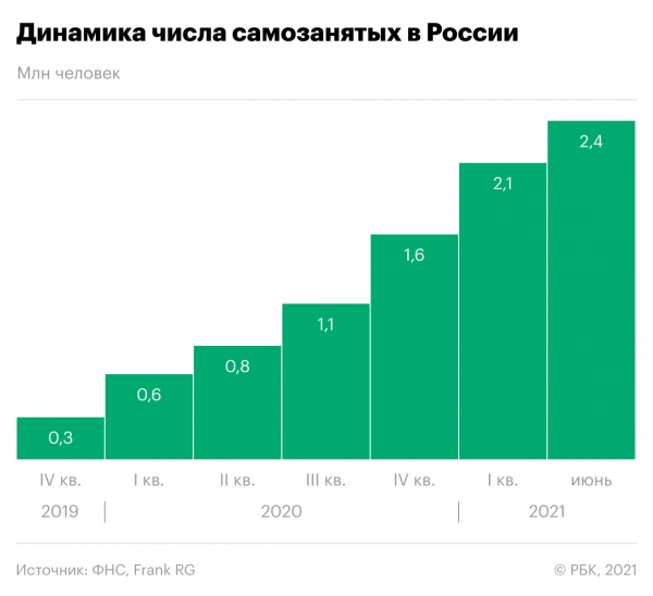Количество официально зарегистрированных самозанятых в России к 2024 году может вырасти до 8,4 млн человек. Такой прогноз содержится в исследовании Frank RG «Самозанятые: потребности и перспективы развития рынка». Это значит, что за 2,5 года число граждан, работающих на себя, вырастет в 3,5 раза. По состоянию на июнь 2021 года в России 2,4 млн самозанятых, говорил на Петербургском международном экономическом форуме глава Федеральной налоговой службы Даниил Егоров.