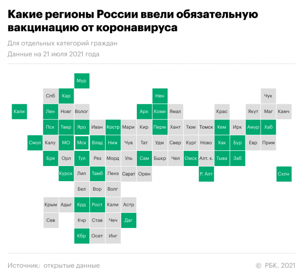В середине июня Москва первой из российских регионов ввела обязательную вакцинацию для некоторых категорий граждан. Столичные власти обязали работодателей нескольких отраслей привить не менее 60% сотрудников первой дозой или однодозной вакциной до 15 июля, второй дозой — до 15 августа. Сейчас число субъектов, где ввели обязательную вакцинацию, достигло почти 40.