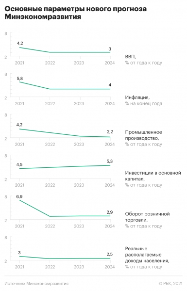 Минэкономразвития подготовило прогноз социально-экономического развития страны до 2024 года. Из позитивного — оценка роста ВВП увеличена до 4,2% в 2021 году. Из негативного — прогноз по годовой инфляции поднят до 5,8%