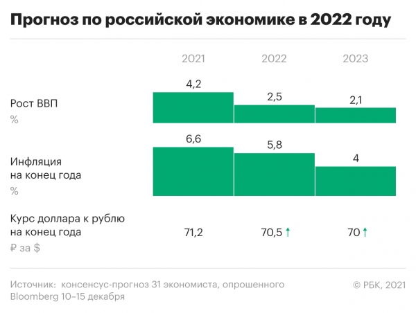 Рост российской экономики в 2022 году замедлится с высоких 4,2–4,3% по итогам восстановительного 2021 года до 2,5%, следует из консенсус-прогноза Bloomberg. В середине декабря агентство опросило три десятка экономистов: разброс их оценок составил от 1,7% (казахстанский исследовательский центр NAC Analytica) до 3,3% (немецкий Berenberg Bank).