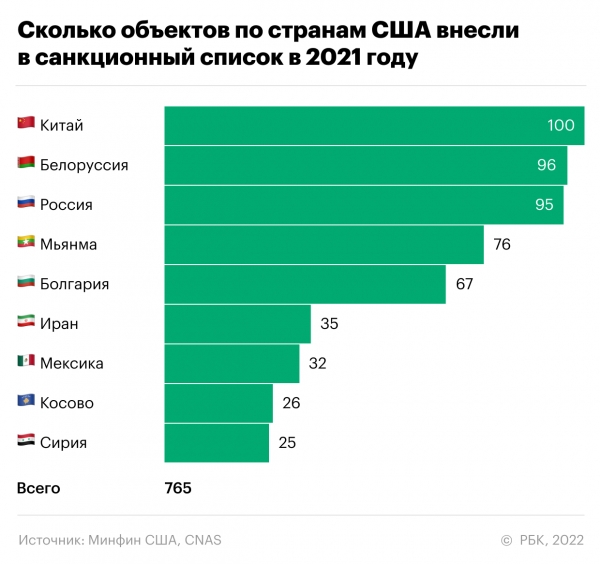 В 2021 году администрация президента США Джозефа Байдена ввела больше всего санкций (по числу внесенных в санкционный список субъектов и объектов) против Китая, Белоруссии и России. Причем Россия по числу новых мишеней (95), добавленных в санкционный список SDN (Specially Designated Nationals), уступила Белоруссии (96), следует из анализа, проведенного экспертами Центра новой американской безопасности (CNAS) в Вашингтоне. На первом месте — Китай со 100 новыми мишенями в списках.
