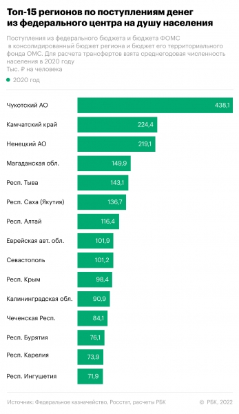 У Федерального казначейства есть статистика, сколько получают регионы из федерального бюджета и фонда ОМС. Лидером по абсолютным поступлениям оказалась Москва, а на душу населения — Чукотка