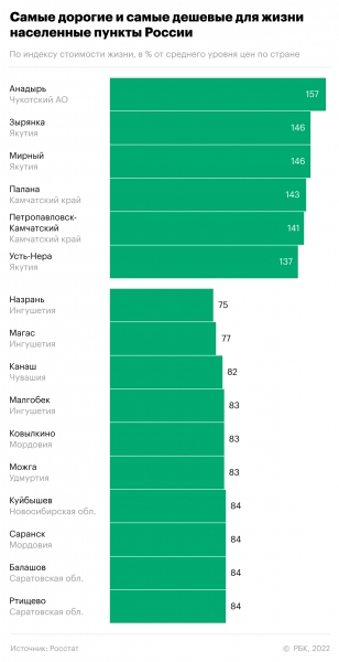 Из данных Росстата следует, что в самом дорогом городе — Анадыре — товары и услуги более чем в два раза дороже, чем в самом дешевом — Назрани.