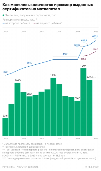 После пика выдачи материнских сертификатов в 2015 году востребованность программы маткапитала стала сокращаться. По данным Пенсионного фонда России, в 2019 году число полученных сертификатов снизилось до 625,5 тыс. — в 1,7 раза по сравнению с 2015 годом, когда за рождение вторых и последующих детей выдали 1,04 млн материнских капиталов. Спад компенсировался в 2020 году, в котором ПФР выдал 1,2 млн сертификатов, это произошло за счет расширения программы на первого ребенка. По предварительным данным, предоставленным РБК Пенсионным фондом, в 2021 году было выдано чуть более 1 млн сертификатов.