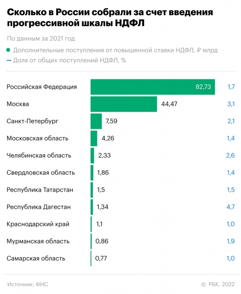 В 2021 году за счет ввода налоговой ставки 15% на доходы россиян свыше ₽5 млн в год федеральный бюджет получил ₽82,7 млрд. Больше половины суммы обеспечила Москва, но в топ-10 регионов также вошли Челябинская область и Дагестан