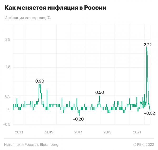 Потребительские цены снизились на 0,02% за неделю с 14 по 20 мая, сообщил Росстат. В последний раз дефляция в недельном выражении фиксировалась в середине августа 2021 года. В годовом выражении инфляция замедлилась до 17,5% по сравнению с 17,7% неделей ранее, указало Минэкономразвития.